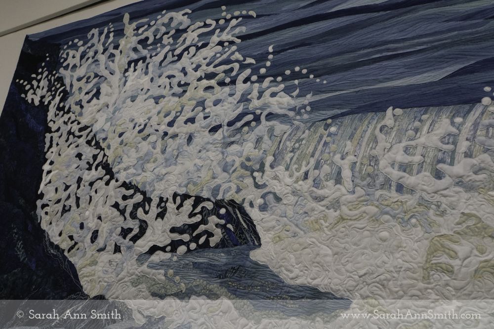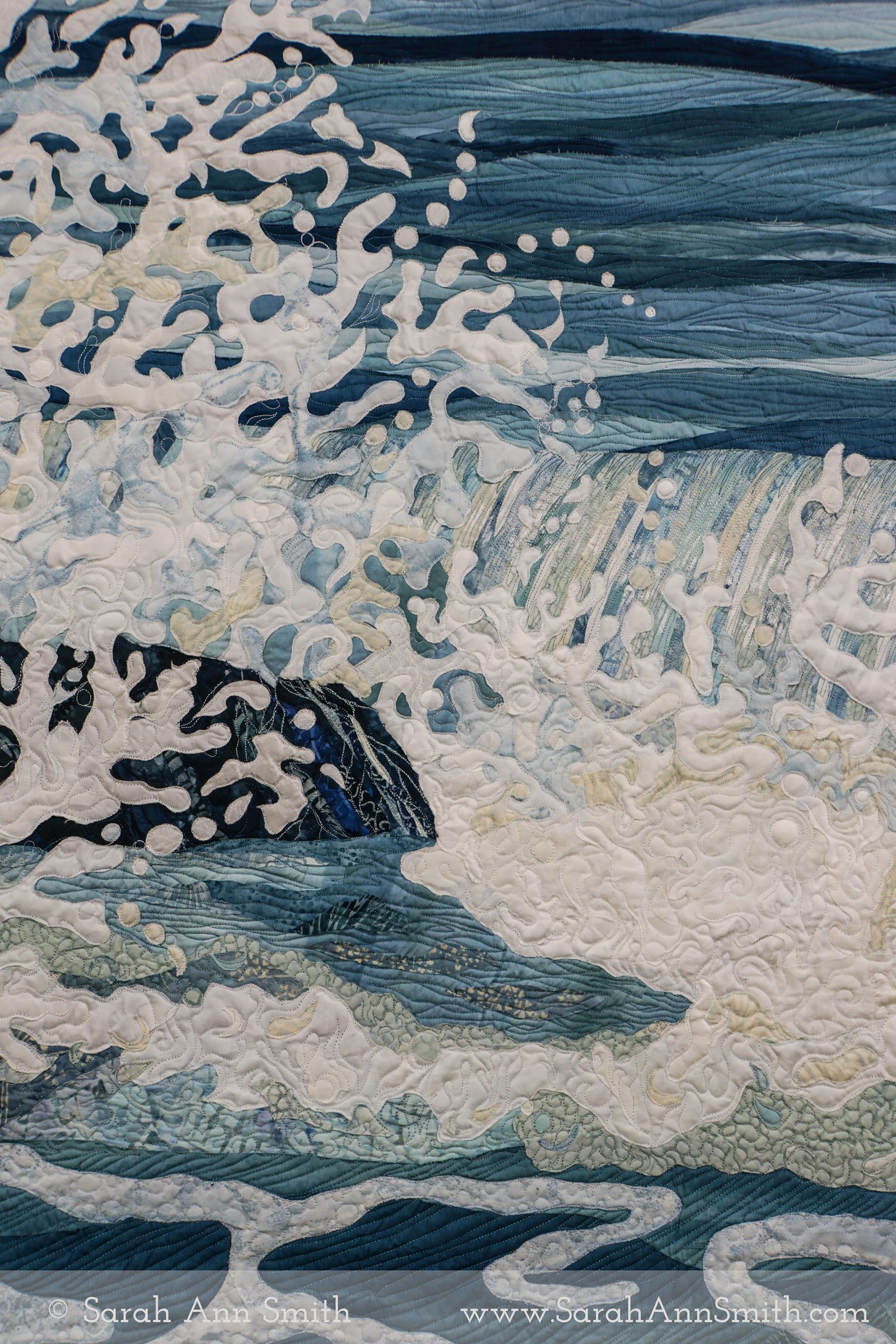 For several years I have been taking pictures of the ocean, especially the Pacific, crashing on the shore. As a wee girl my elderly father would take me to the beach after school, even on foggy, stormy days. I have since loved those deserted beaches and the powerful waves thundering as they reach the cliffs and land. I dyed the fabrics for the distant and near ocean, and used commercial batiks as well as my hand-dyeds for the cliffs and breaking waves. Made for Quilts Inc. to use to promote and was displayed at the exhibit Sapphire Celebration, which celebrated the International Quilt Festival's 45th Anniversary in October-NOvember 2019. Check here and scroll down for more information. Size: 59" tall by 80" wide. Sold in 2019. In a private collection. THANK YOU to my collector!