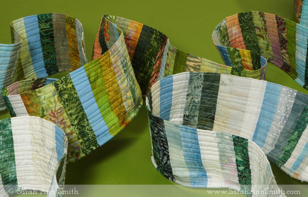 Time is not a river. It is an endless cycle of growth and dormancy, of memories and mist, of day and night. Time is color, each band marks a day. Time is collective memory is time, flowing endlessly into and out of consciousness. A call for entry for a three-dimensional exhibit spurred me to make my first true 3-D textile art piece. Each strip of cloth was cut 24 centimetres long by 1 inch wide, with 365 strips to make the endless loop of time. y When I began, quite unusually for me, I had NO idea what final shape this ribbon of time would take. At first I thought of a Mobius strip which is a loop with a twist, but the 365" circumference of the loop and challenges displaying a twisted loop convinced me to remove the twist. I decided to add wire the the bottom edge which I could then shape. This mean I needed to sew it to the bottom: let me tell you, wrangling 30 feet of wire was a challenge I would prefer to avoid in the future. I've learned a lot about 3-D construction, and now have some ideas about how to approach similar installation pieces in the future: smaller units that velcro or otherwise attach or hang independently is at the top of the list Completed February 2019 Size: variable, but the footprint is approximately 36 x 72 inches, with a height of 5-7 inches. Materials: artist-dyed and commercial cottons, batting, wire.