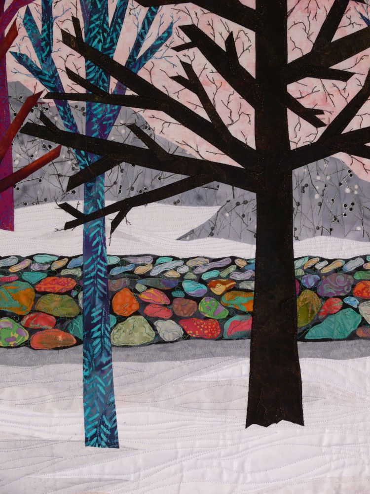This quilt continues the Sense of Place series begun with "The Tree." I love the feeling of security and hominess imparted by the snow and the old stone walls that transform hillsides and fields into tracery. Just before sunset, these trees and wall glow with the colors of my imagination. For sale: $1195. $ 1,195.00